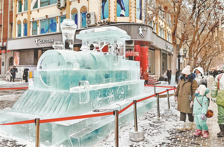 中央大街與西四道街交口,一列冰火車吸引了人們的目光。小火車制作精美,晶瑩剔透,成為老街上一處新打卡點(diǎn)。