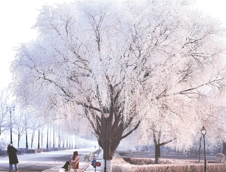 19日早晨,哈爾濱市許多地方出現(xiàn)霧凇景觀,城市被裝點得非常美麗。
