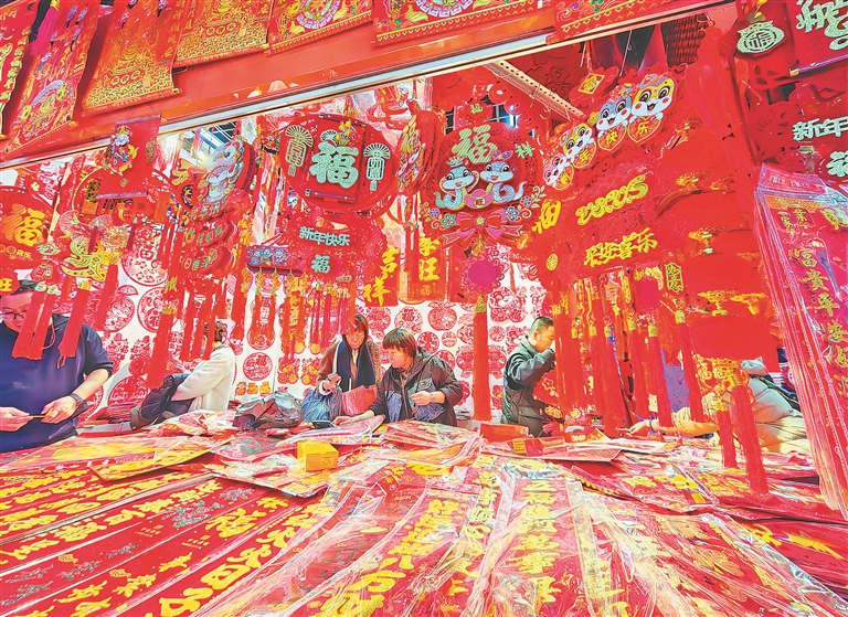 春節(jié)臨近,哈爾濱市道里區(qū)一處批發(fā)市場內(nèi),市民們正在購買各種節(jié)日飾品,用來裝點(diǎn)家居,迎接新春佳節(jié)的到來。蛇年主題的燈籠、對聯(lián)、福字等擺滿了柜臺(tái),紅紅火火,喜慶氣氛濃厚。人們臉上都洋溢著幸福的笑容,一邊逛一邊買,個(gè)個(gè)滿載而歸。