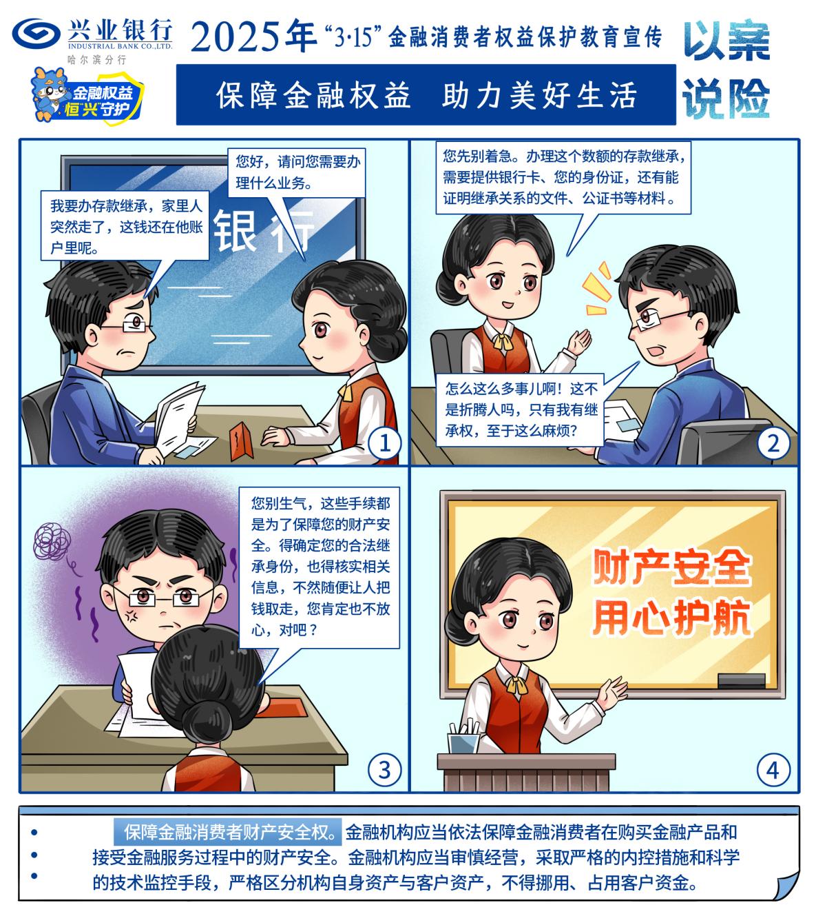 “保障金融權益 助力美好生活”,興業(yè)銀行哈爾濱分行2025年“3·15”金融消費者權益保護宣傳活動進行中,本期向您介紹金融消費者八項權益中的財產安全權。