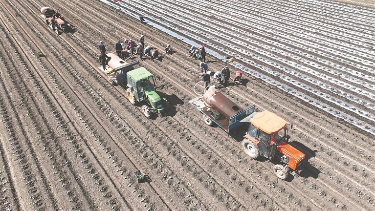 通往新華鄉(xiāng)的道路兩側,儼然一幅動態(tài)的農事畫卷:拖拉機“突突”作響,拉著水罐在田壟間穿梭;菜農們分工默契,有人鋪設地膜,白色薄膜在黑土地上延展成浪;有人彎腰移栽,鮮嫩菜苗被小心植入土中;有人手持水管緊隨其后,清水汩汩滋潤著新苗。覆膜、栽苗、澆水,動作連貫流暢,田埂間回蕩著農具與泥土的碰撞聲,交織成初夏最生動的勞作交響。
