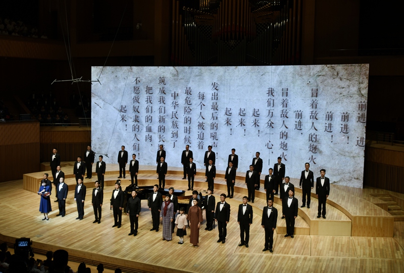 第一篇章《松花江上》以《長城謠》的泣血鄉(xiāng)愁與《義勇軍進行曲》的全場肅立高唱,訴盡抗戰(zhàn)時期的流亡之痛與民族豪情,更創(chuàng)新植入“童年、少女、青年”三代“蕭紅”扮演者(張舒涵、鄭楚琪、尤泓斐)與合唱團的情景互動。第二篇章《抗戰(zhàn)的烽火》中,《五月的鮮花》《露營之歌》《保衛(wèi)黃河》等作品以合唱與立體站位,緬懷趙一曼、楊靖宇等英烈,再現(xiàn)全民抗戰(zhàn)的壯闊圖景。第三篇章《文脈永續(xù)》則通過魯迅、茅盾等文學(xué)名家對蕭紅的評價、跨年代讀者代表致敬及《致祖國》的磅礴合唱,彰顯其文學(xué)精神在新時代的傳承。