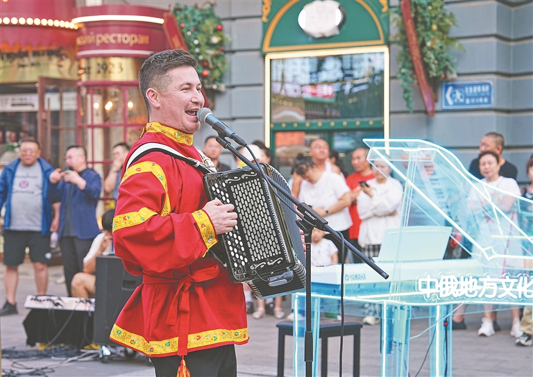 中央大街一隅,熱情洋溢的俄羅斯演員或奏響悠揚(yáng)的巴揚(yáng)樂曲,讓充滿異域風(fēng)情的旋律在空氣中流淌;或以靈動(dòng)的舞姿演繹俄羅斯文化,用熱情奔放的節(jié)奏點(diǎn)燃現(xiàn)場氣氛。市民和游客近距離感受俄羅斯文化的魅力。