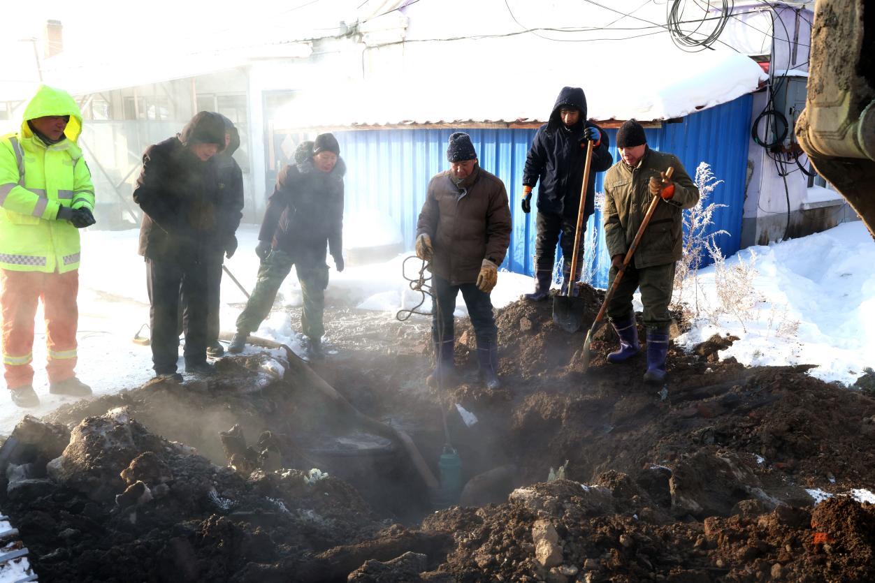當日早8時許,物業(yè)公司巡線員巡查時發(fā)現(xiàn)西華路平房區(qū)地面冒熱水,立即上報并啟動搶修預案。7名搶修人員火速趕赴現(xiàn)場,現(xiàn)場分工明確、緊張有序,有的安裝水泵排水,有的接駁應急電源,有的揮鎬刨挖凍土層,同時調配小型挖溝機輔助作業(yè)。