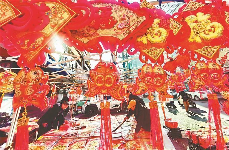 13日,哈爾濱市道外區(qū)大水晶街附近的集市上,許多市民在購買年貨。集市上,各種商品琳瑯滿目,應有盡有。紅燈籠、“福”字、對聯(lián)烘托出濃濃的喜慶氣氛。人們臉上都洋溢著幸福的笑容,個個滿載而歸。
