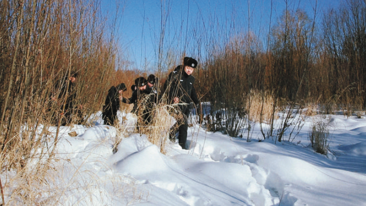 2月15日,漠河市公安局西林吉鎮(zhèn)派出所民警輔警入山踏查。張雪婷攝