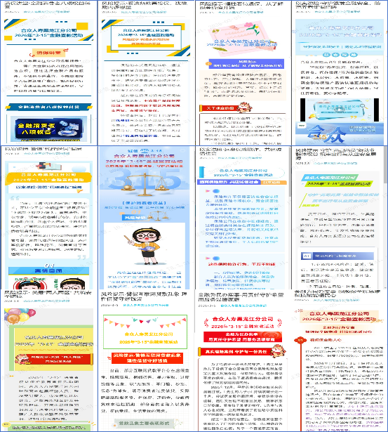 在線下陣地建設(shè)與宣傳活動中,合眾人壽黑龍江分公司及轄內(nèi)各機構(gòu)已全面完成宣教陣地布置,通過懸掛主題條幅、張貼宣傳海報、設(shè)立公益金融宣教專區(qū)等方式,營造規(guī)范有序、主題鮮明的活動氛圍,為廣大客戶提供一對一金融知識咨詢與風險識別服務(wù)。下一步,分公司及轄下各機構(gòu)將開展銷售人員專項培訓,強化消保主體責任,筑牢銷售環(huán)節(jié)風險防線。同時,也將因地制宜開展金融知識“五進入”活動,推動消保政策與金融知識走進農(nóng)村、社區(qū)、校園、企業(yè)和商圈,提醒消費者科學理性審慎投資,引導消費者審慎投資消費,依法理性維權(quán),增強風險防范意識,提升自我保護能力,切實將金融宣教服務(wù)延伸至基層“最后一公里”。