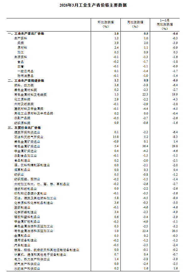 2026年3月份,全國(guó)工業(yè)生產(chǎn)者出廠價(jià)格同比由上月下降0.9%轉(zhuǎn)為上漲0.5%;環(huán)比上漲1.0%,漲幅比上月擴(kuò)大0.6個(gè)百分點(diǎn)。工業(yè)生產(chǎn)者購(gòu)進(jìn)價(jià)格同比由上月下降0.7%轉(zhuǎn)為上漲0.8%;環(huán)比上漲1.2%,漲幅比上月擴(kuò)大0.5個(gè)百分點(diǎn)。一季度,工業(yè)生產(chǎn)者出廠價(jià)格比上年同期下降0.6%,工業(yè)生產(chǎn)者購(gòu)進(jìn)價(jià)格下降0.5%。