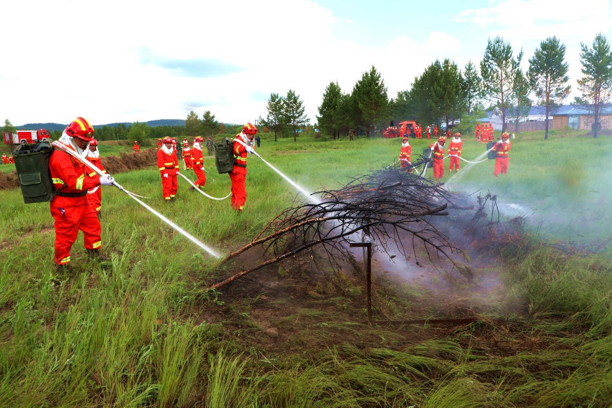 阿木爾林業(yè)局專業(yè)撲火隊(duì)員實(shí)戰(zhàn)演練“以水滅火”科目(王力 攝)