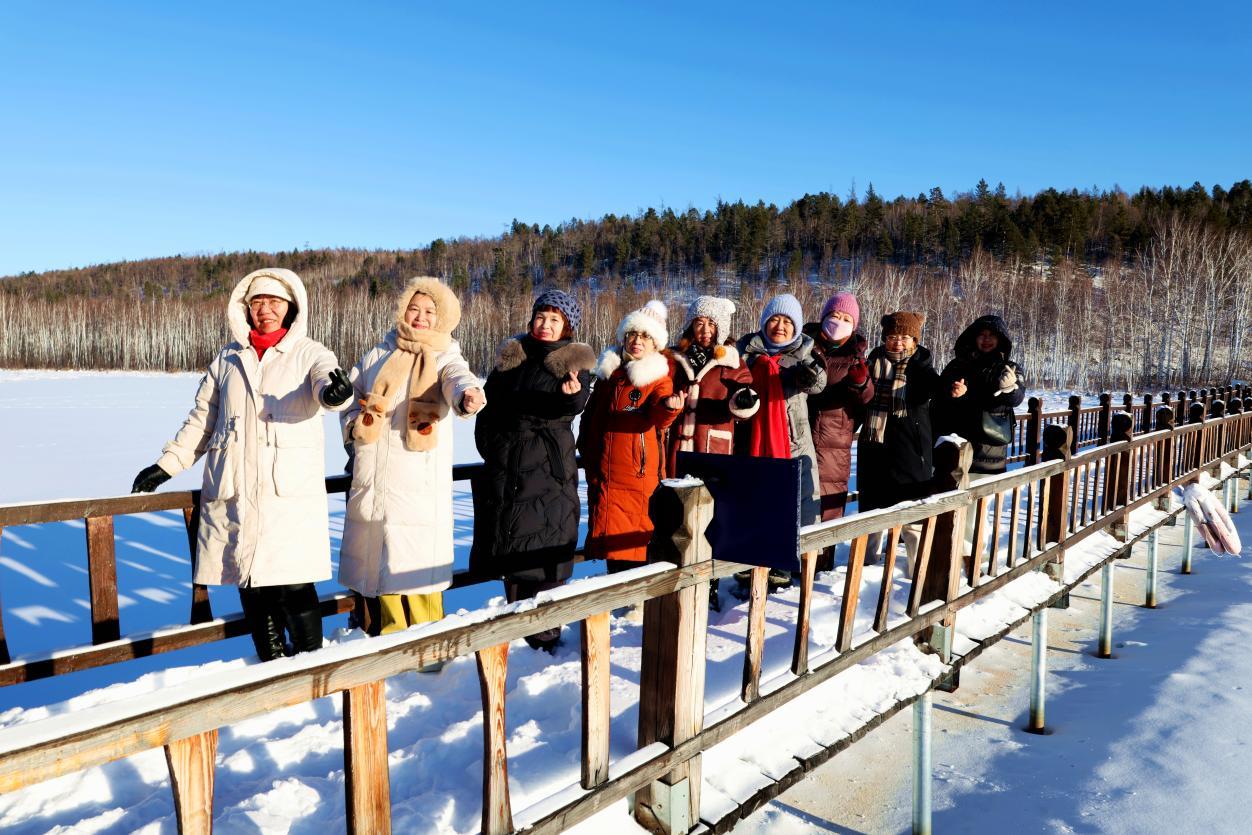 黑龍江省詩詞協(xié)會(huì)采風(fēng)團(tuán)成員在雙妃湖,為冰雪的靈動(dòng)與文化的融合點(diǎn)贊(王力 攝)