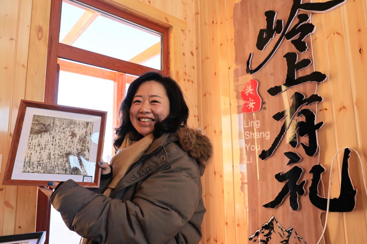 北京游客對(duì)“嶺上有禮”樺樹皮畫產(chǎn)生濃厚興趣,并主動(dòng)代言推介(王力 攝)